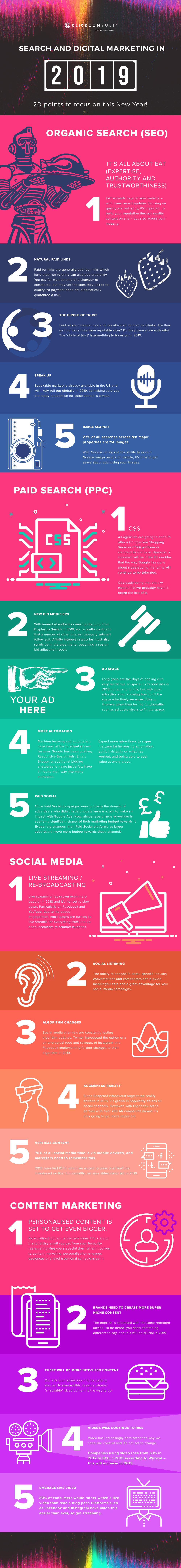 Una infografia con 20 tendencias en Marketing Digital. Vía Click Consult