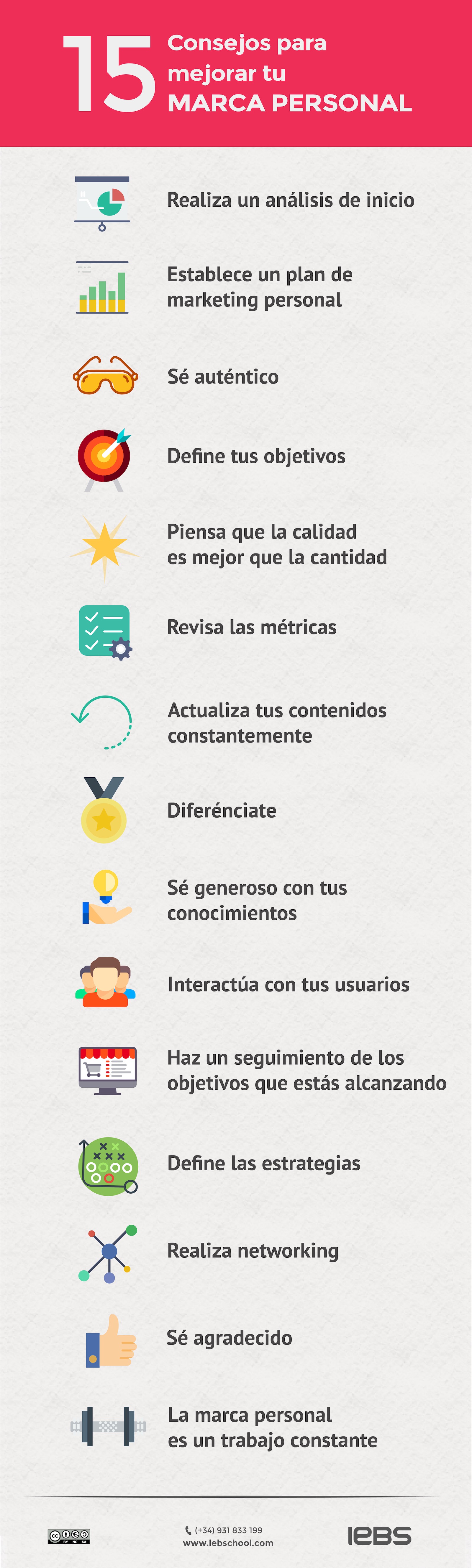 Una infografía con 15 consejos para mejorar tu Marca Personal. Vía IEB School
