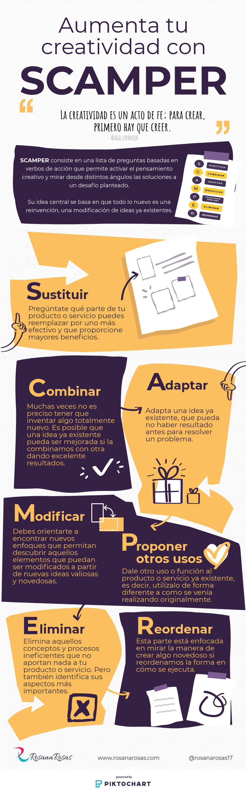 Una infografía titulada “Aumenta tu creatividad con SCAMPER”. Vía Rosana Rosas