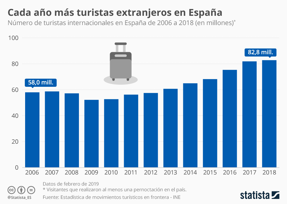 Una infografía con la Evolución del número de turistas internacionales en España. Vía Statista
