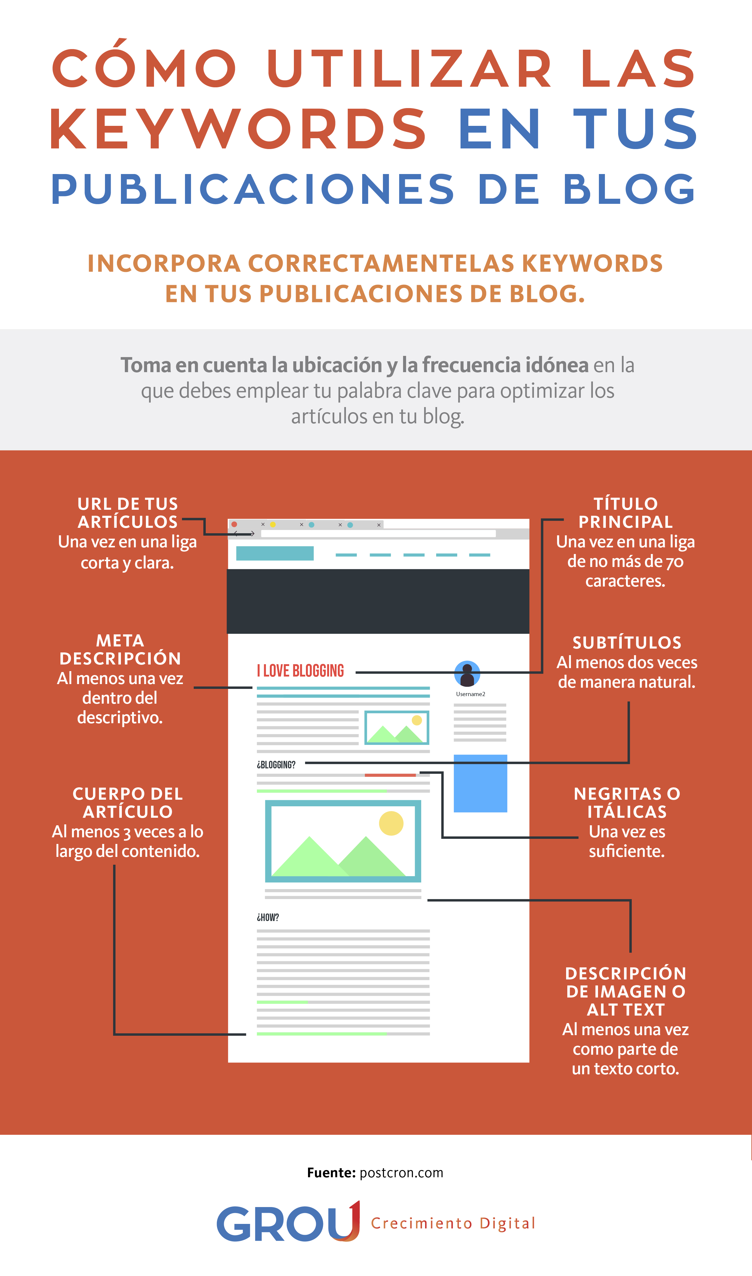 Una infografía sobre cómo utilizar Keywords en las publicaciones del Blog. Vía GROU