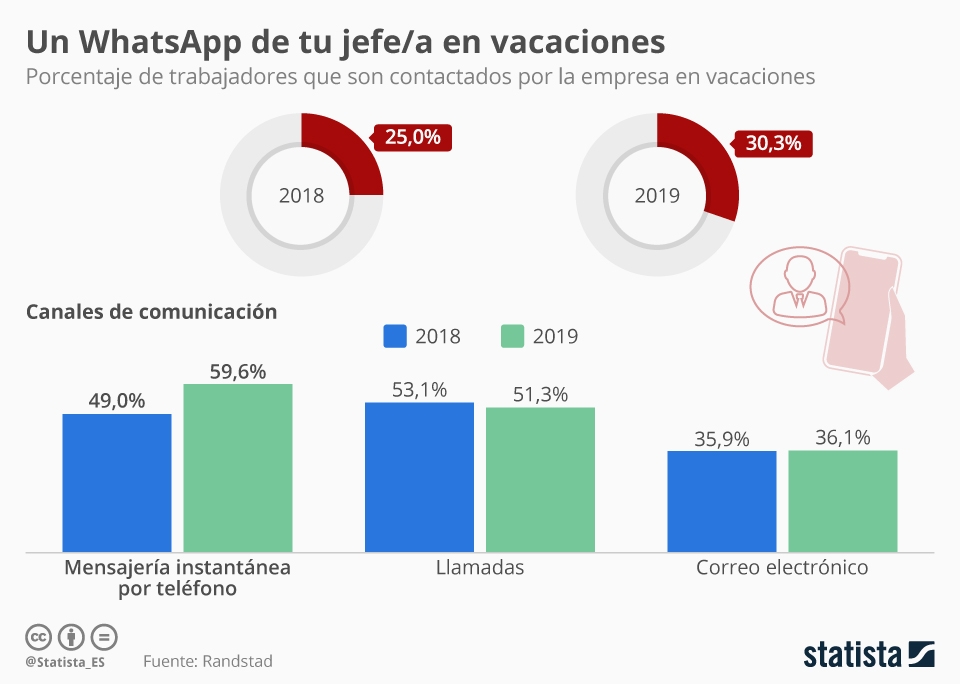 Una infografía sobre porcentaje de empresas que contactan con sus trabajadores en vacaciones. Vía Statista