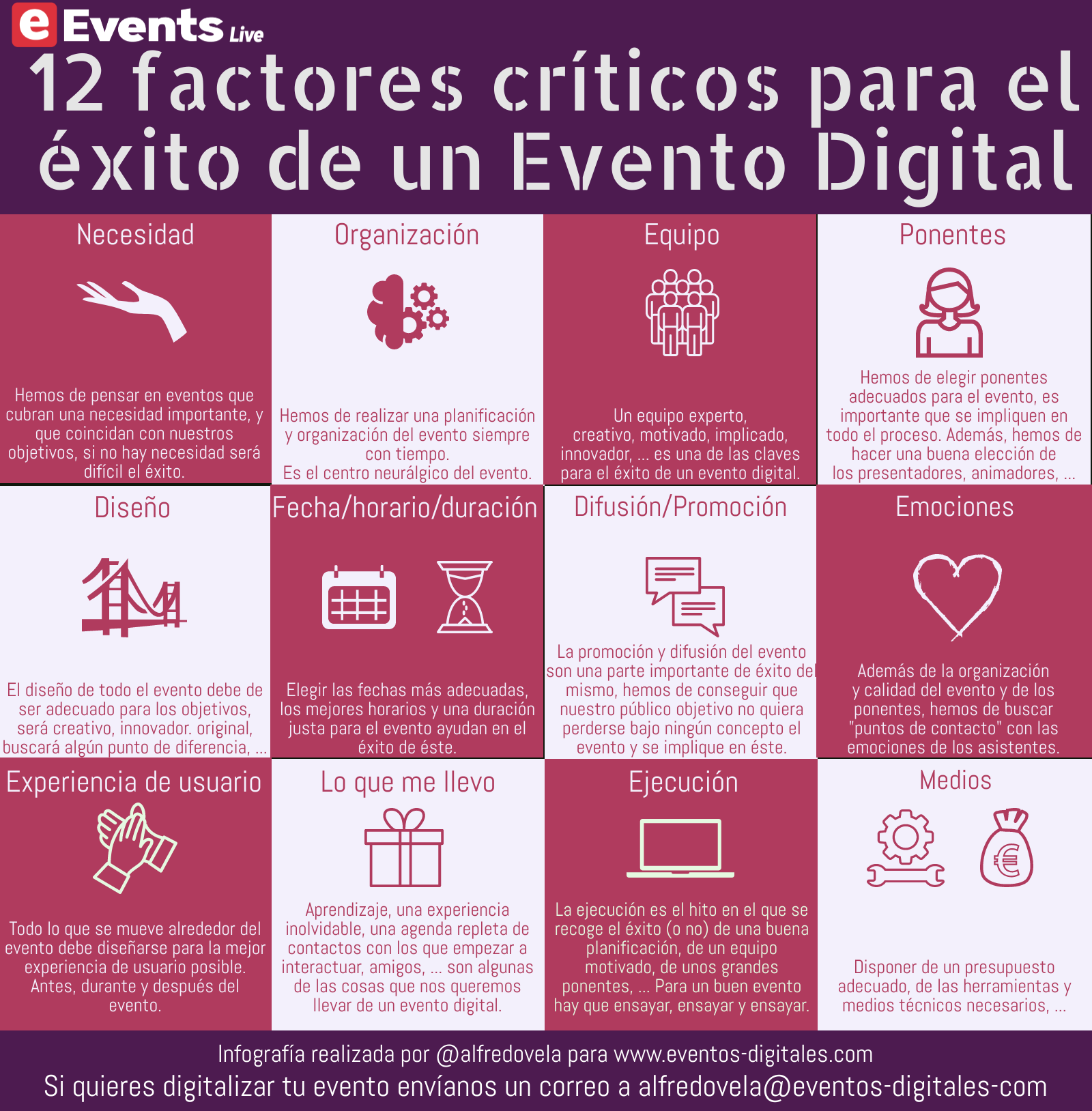 Una infografía con 12 factores críticos para el éxito de un Evento Digital. Vía eEvents Eventos Digitales