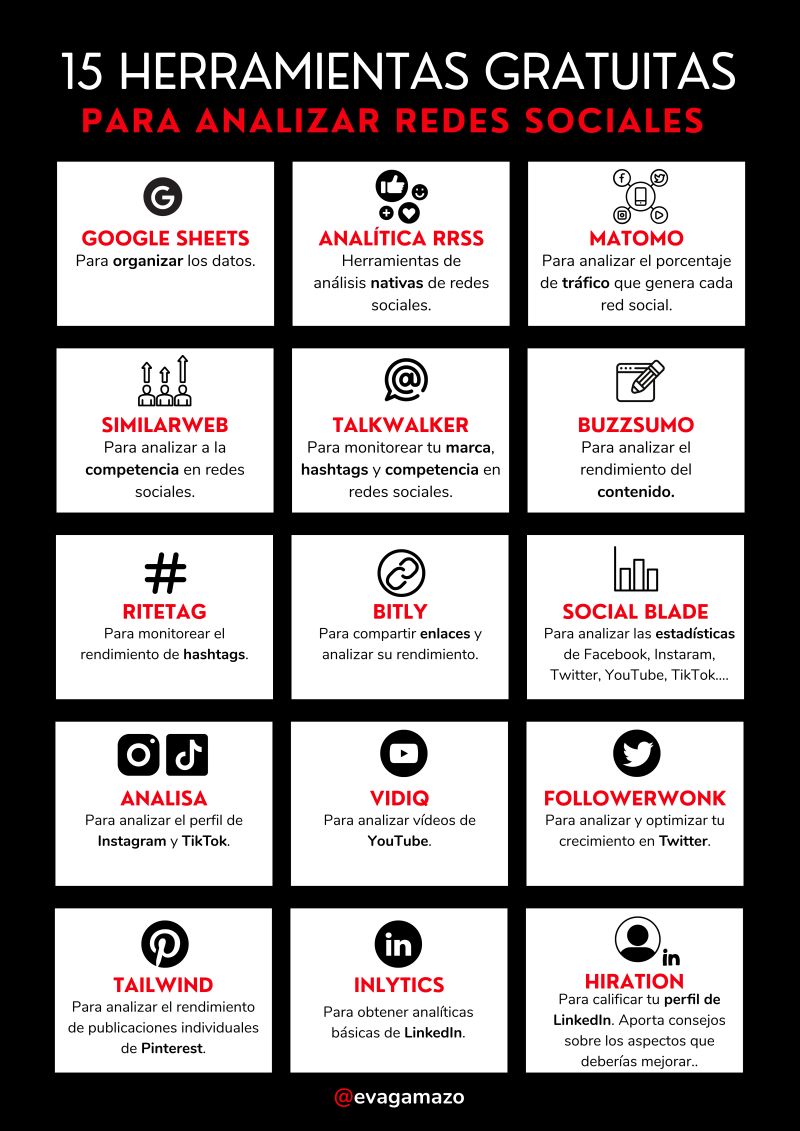 Una infografía con 15 herramientas gratuitas para analizar redes sociales. Vía Eva Gamazo